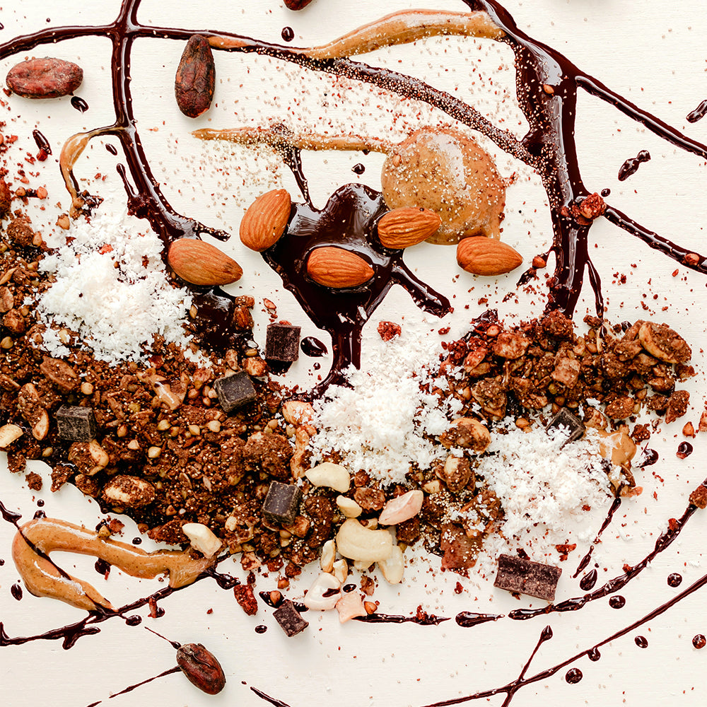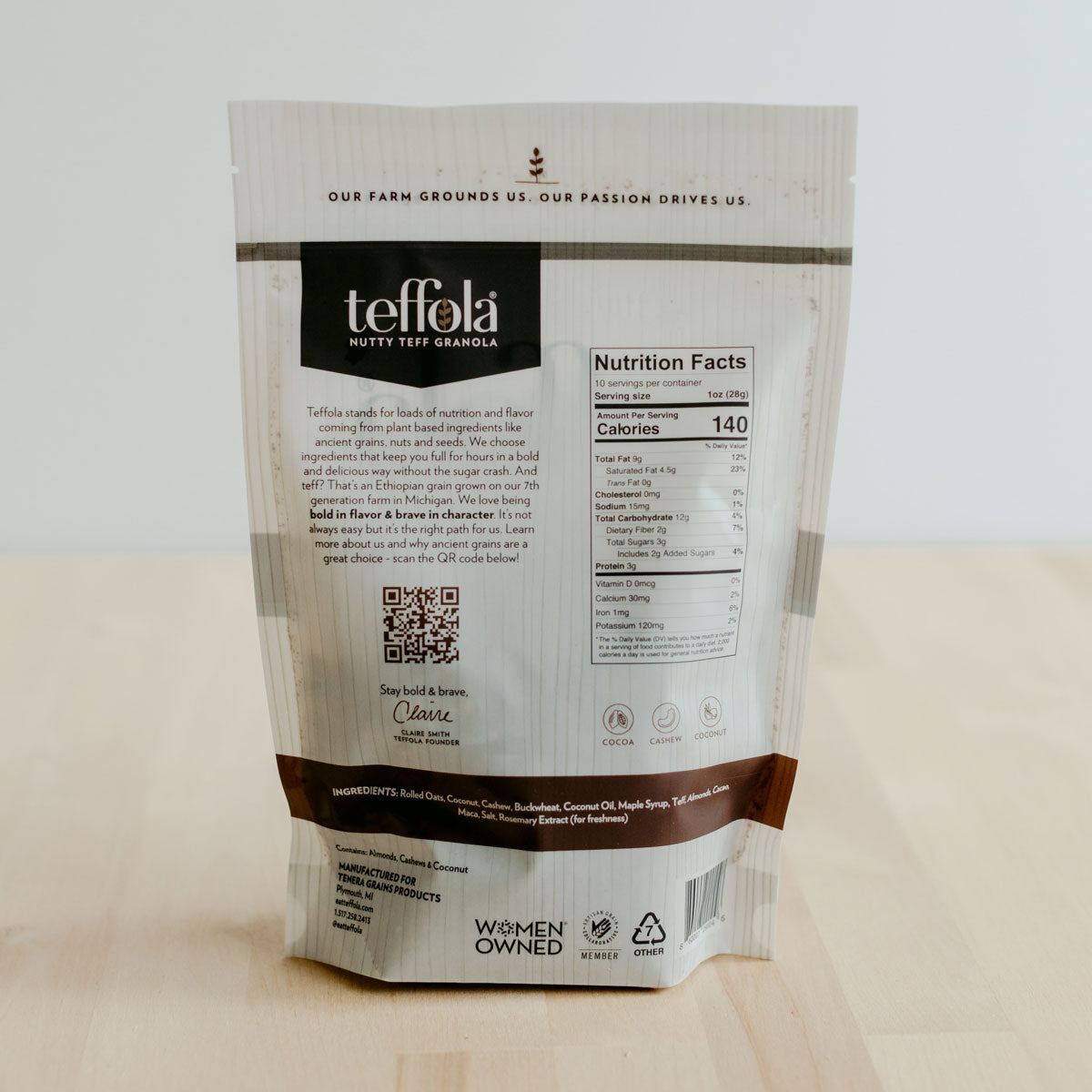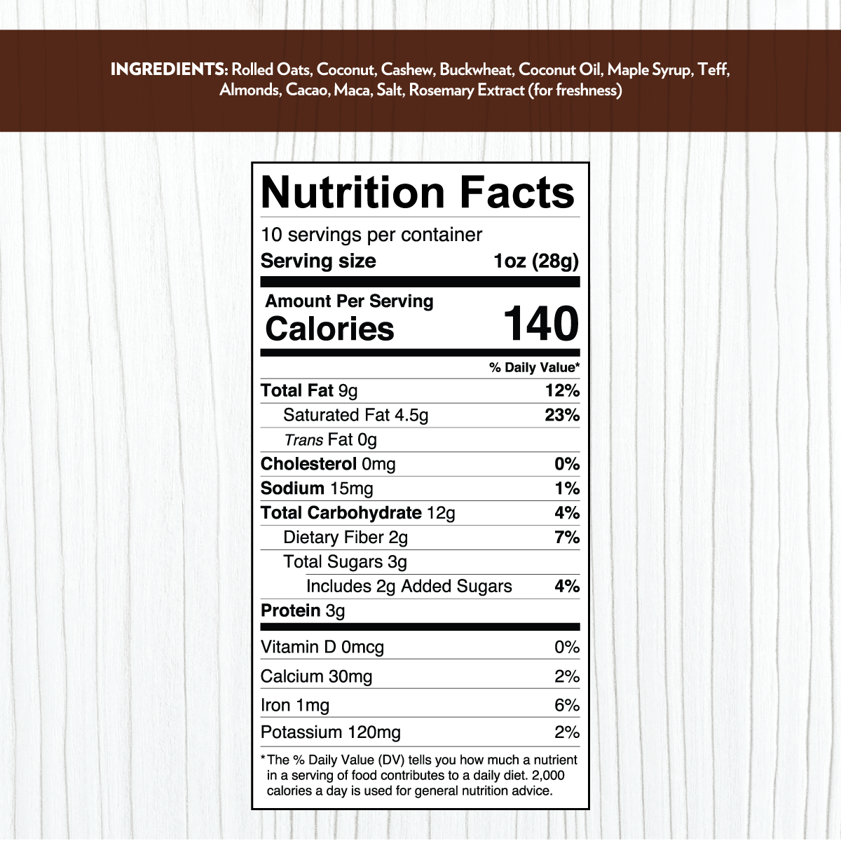 Ingredients: Rolled Oats, Coconut, Cashew, Buckwheat, Coconut Oil, Maple Syrup, Teff, Almonds, Cacao, Maca Powder, Salt, Rosemary Extract (for freshness)